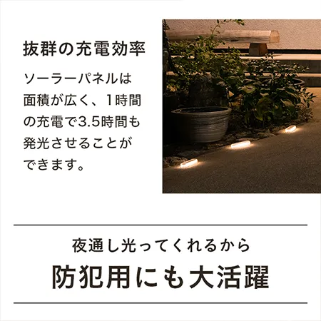 街灯が少なめの自宅駐車場に設置するため購入。時々車が乗り入れる場所に置いてみました。スリムな形で場所を選ばず、角がないので小さな子がいても安心して置くことができます。