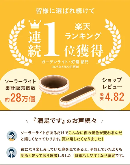注文後すぐに届き、すぐに箱を開けて午後から置きました。夜になり楽しみしていた庭を見てみると、予想していたよりも明るく光っており感激しました!夜の駐車もしやすくなり満足です。他のシリーズも楽しみに少しずつ増やしていきたいなーと思います!